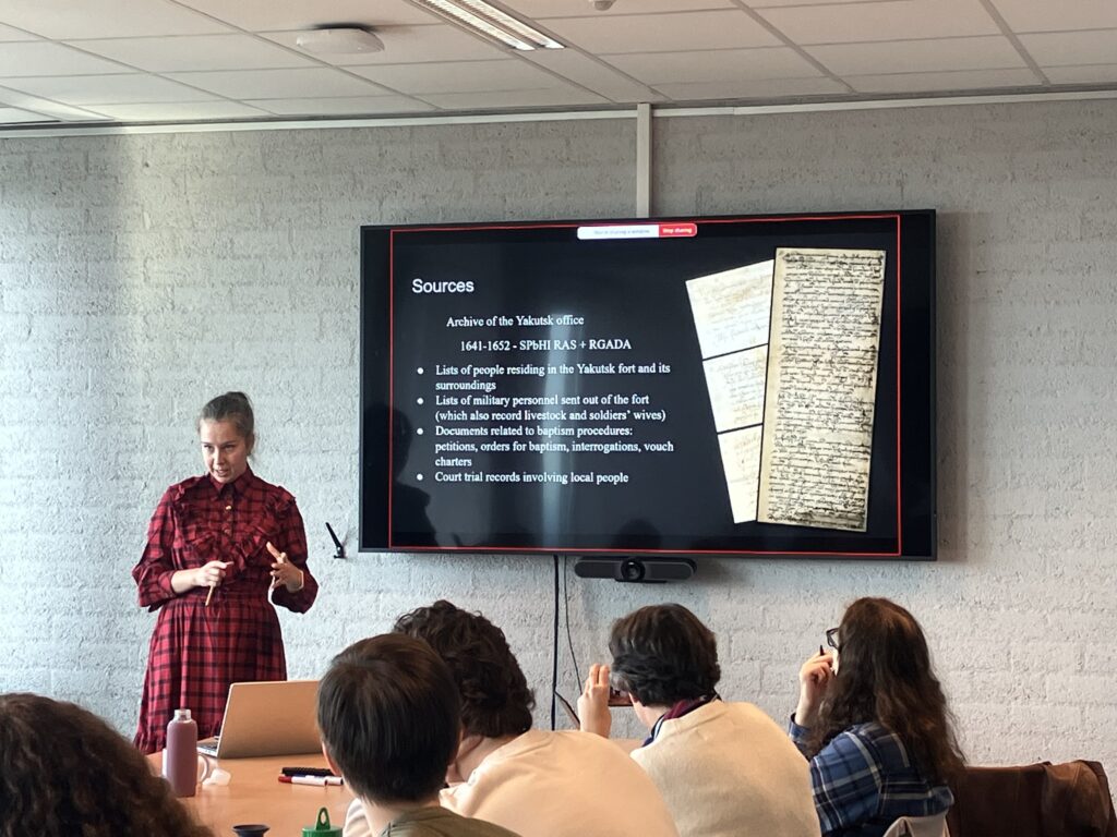 In the first presentation, Angelina Kalashnikova explored the incorporation of Siberia into the Russian Empire and the intertwinement of state and local practices in forming coercion, dependency and cross-cultural relations. By sharing in detail source material, especially focusing on its challenges, limitations and biases, she highlighted the role of indigenous people and the subjugated position of women in general in different bondage regimes or human trafficking practices that clashed or connected in early modern Siberia. Kalashnikova stressed the importance of critically engaging with documents like petitions, sale deeds, and baptism records because of its seventeenth-century formulaic style that effectively silenced many voices trapped in these bureaucratic Russian documents. After all, these sources were mostly written from an imperial perspective – Kalashnikova briefly touched upon the historiographical debate whether we can call this colonial or not – and thus personal life stories were not of concern to the target audience, i.e., state officials. She reiterated the point that women in these sources were consistently depicted as objects – of commercial transactions, for example, or of conversion.